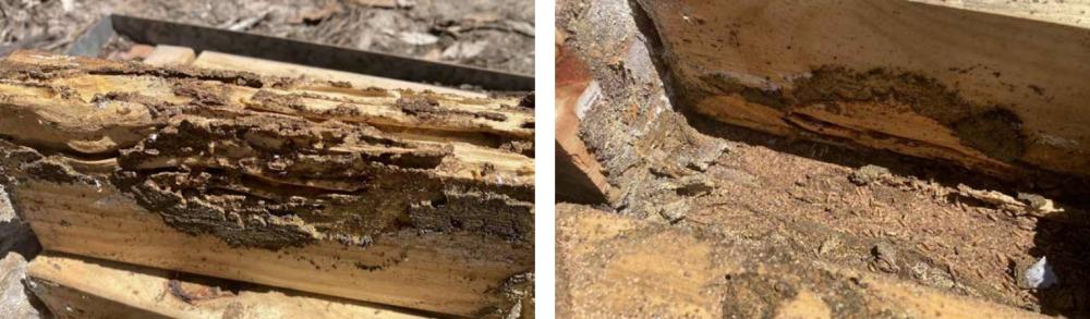 Plots were inspected bi-monthly for termite activity in the timber (simply lifting top paver). Once termites had established throughout the timber structures, the plots were treated. This design ensured that only the entry through established leads, then through the soil and over the base paver was possible.
