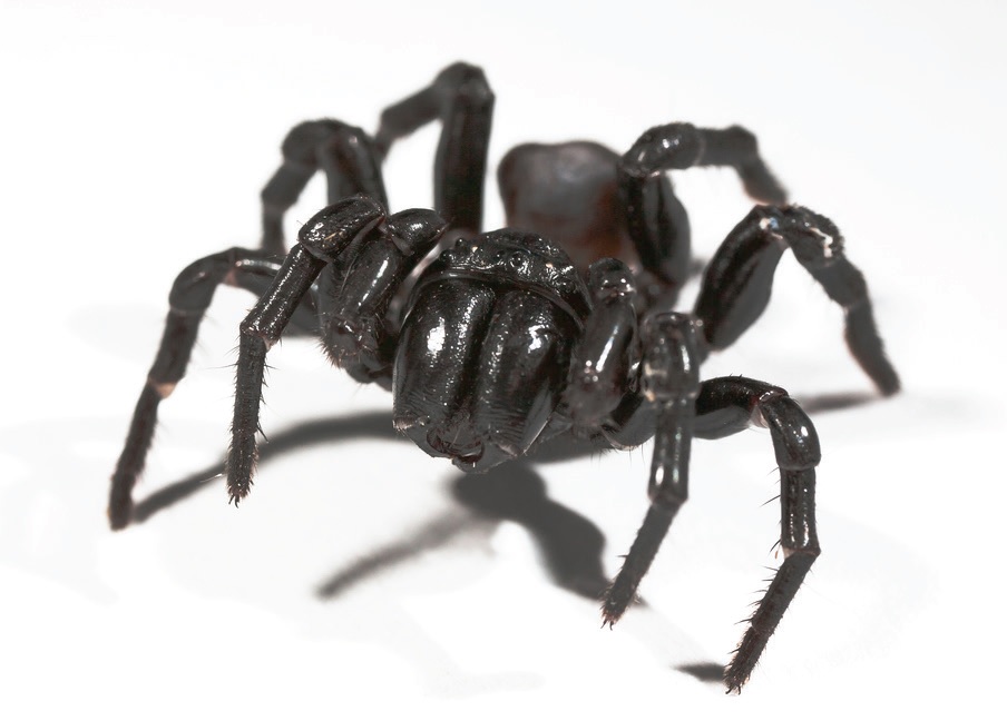 Sydney Funnel-webs are shiny, dark brown to black spiders with finger-like spinnerets (silk-spinning organs) at the end of their abdomen. Males have a large mating spur projecting from the middle of their second pair of legs. If threatened, Sydney Funnel-webs show aggressive behaviour, rearing and displaying their impressive fangs.
