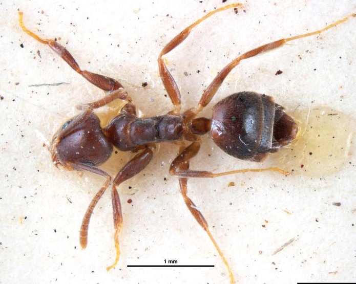 The white-footed ant looks similar to the Argentine ant, Linepithema humile, however, the petiole of the Argentine ant has a vertical projection that is lacking on the white-footed ant.