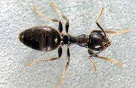White Footed House Ants (Technomyrmex albipes) is a medium small (2.5-3 mm long), black to brownish-black ant with yellowish-white tarsi (feet) and a one-segmented waist, they have five abdominal segments, 12-segmented antennae, few erect hairs, and no sting.